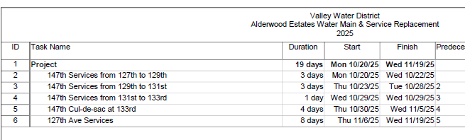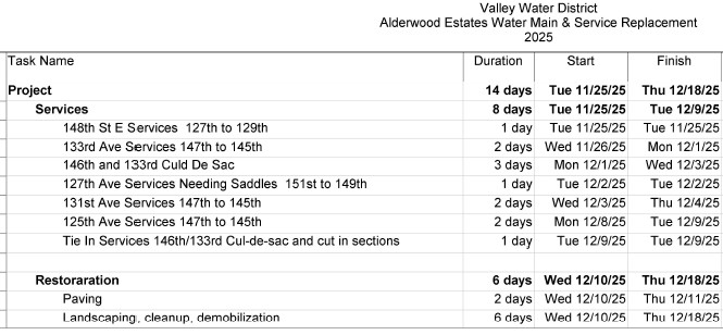 Alderwood Watermain Replacement Project Work Schedule - see below
