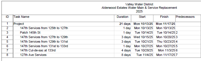 Alderwood Watermain Replacement Project Work Schedule - see below